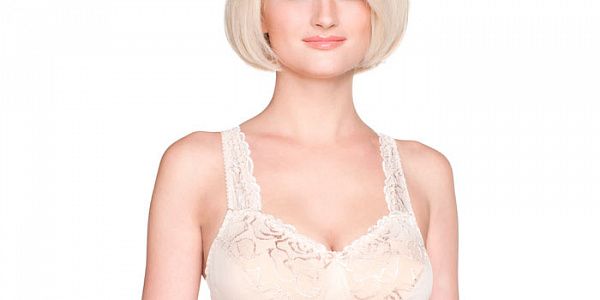 Бюстгальтер ортопедический из трикотажного полотна и кружева. Обхват регулируется многоуровневой застёжкой сзади. Специальный кармашек из хлопка для протеза (с тремя открытыми швами) находится с обеих сторон. Широкие бретели, украшенные кружевом, снимают напряжение с плеч и шеи. Высокая линия декольте и расширенный пояс скрывают следы оперативного вмешательства.