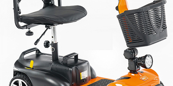 Электрический скутер снабжённый рулём мотоциклетного типа и поворотным сиденьем с откидывающимися подлокотниками, которое делает посадку и высадку из кресла элементарной даже для пользователей, имеющих ощутимые трудности с перемещением.
