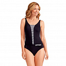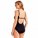 Элегантный купальник с классическим сочетанием черного и белого и дополненный ретро полоской. Закрытая модель купальника с высоким вырезом и широкими бретелями. Крой купальника имеет заниженный пояс на бедрах, разделяя фигуру. Декоративная полосатая вставка разбавляет строгий силуэт, делая его более кокетливым. Интересным элементом служит небольшой бантик на левом бедре. Глубокий вырез на спине снабжен дополнительным креплением в области лопаток для лучшей фиксации на теле.