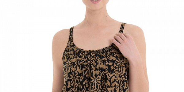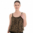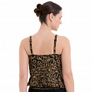 Топ-танкини со встроенными мягкими чашками, в удобной для фигуры форме oversize, свободно ниспадающий, но облегающим широким поясом на бедрах.Тонкие складки по центру выреза декольте, тонкая отделка по линиям декольте и проймы. Регулируемые бретели с прямоугольными металлическими кольцами в золотисто-черном цвете.