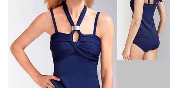 Купальник - танкини состоит из плотной верхней части с карманами для протеза и удобными трусиками. Верхняя часть украшена элегантной шнуровкой и серебристой брошью, создающими привлекательное декольте.