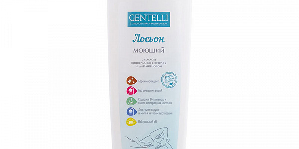 Моющий лосьон Gentelli с маслом виноградных косточек и Д-пантенолом для мягкого очищения сухой и чувствительной кожи. Лосьон эффективно очищает кожу и удаляет неприятные запахи, не маскируя их, после применения остается полное ощущение комфорта (имеет нейтральный уровень pH). Д-пантенол и масло виноградных косточек оказывают питательное, увлажняющее и регенерирующее защитные действия.
