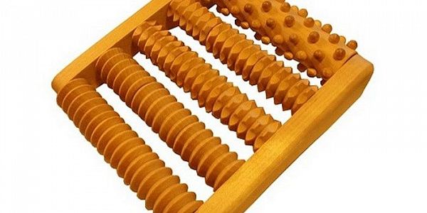 Сядьте на стул. Босые ноги поставьте на деревянный массажер, находящийся на полу.