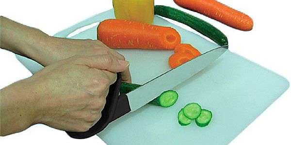 Специальный нож с эргономичной закрытой ручкой, с лезвием под углом для более удобного использования и поддержания запястья в естественном положении для минимизации усилий при резке.