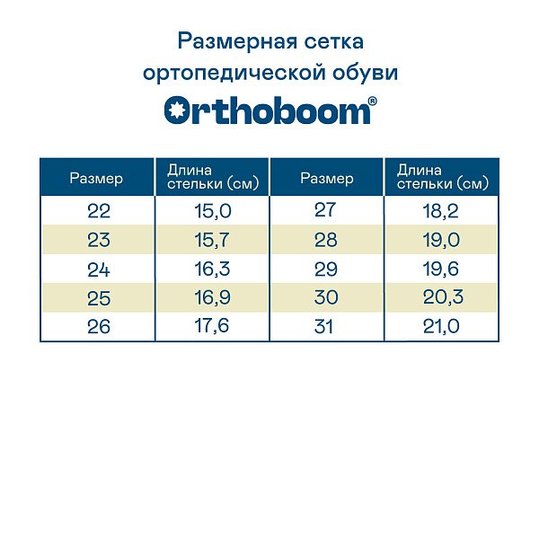 Сандали ортопедические Ортобум для мальчиков 27057-01 темно-синий бриз ОРТОБУМ Материал верха: натуральная кожа Материал подклада: кожподкладка Материал стельки: нат.кожа Вид застежки: 3 ремня (3 липучки) Материал подошвы: ТЭП Детские сандалии —  модель с продуманной конструкцией и уникальным дизайном. Инновационная анатомическая колодка, обеспечивающая правильное положение стоп, сводоформирующие стельки, а также другие ортопедические элементы препятствуют развитию плоскостопия или предотвращают дальнейшую деформацию, если патология уже выявлена. За счет широкой раскрываемости модель легко надевается и снимается без дискомфорта. Для верха используется натуральная кожа, внутри — кожподкладка, что гарантирует отличную износостойкость и правильный микроклимат. А нескользящая подошва снижает риск падения на любой поверхности. Лето в такой обуви пройдет с максимальным комфортом независимо от климатических условий. Показания к применению Начальные проявления плоскостопия. Плоскостопие 1-2 степеней. Распластанность переднего отдела стопы 1-2 степени. Реабилитация после травм и операций на стопе и голеностопном суставе. С целью профилактики для предупреждения развития патологии стопы. Подбор размера Определите размер по следующей последовательности:     1. Поставьте ногу на чистый лист бумаги.     2. Отметьте крайние границы ступни.     3. Измерьте расстояние между самыми удаленными точками стопы.     4. Найдите соответствующий размер в таблице размеров, расположенной ниже. 27057-01chu /upload/iblock/3eb/3eb9156fb5efa946f26ad26b7cbf4c86.jpg